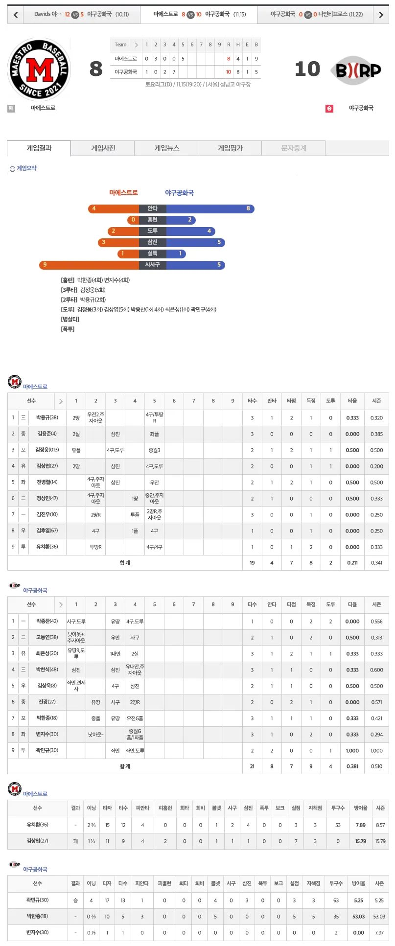 야구공화국 공지사항 더보기 야구 2025-11-29 (토) 성남고리그 토요D조 게임 공지 (두번째경기 10:30) +13 13 일전 야구 2025-11-29 (토) 성남고리그 토요D조 게임 공지 (첫번째경기 08:30) +13 13 일전 야구 2025-11-22 (토) 성남고리그 토요D조 게임 공지 +12 20 일전 자유게시판 더보기 야구공화국 자유게시판 이용 안내 59 일전 라인업 기록실 게임 리뷰 2025-11-29 (토) 10:30 성남고리그 토요D조 라인업 2025-11-29 (토) 08:30 성남고리그 토요D조 라인업 2025-11-22 (토) 15:00 성남고리그 토요D조 라인업 2025-10-11 (토) 17:00 성남고리그 토요D조 라인업 2025-11-22 (토) 성남고리그 토요D조 경기 결과 2025-11-15 (토) 성남고리그 토요D조 경기 결과 2025-10-11 (토) 17:00 성남고리그 토요D조 경기 결과 2025년 11월 22일 게임 리뷰: 10월 11일 게임 리뷰 — 기본기에서 무너진 시합 갤러리 더보기 경기 후 회식(2차) 성남고리그 토요D조 - 2025년 10월 11일 (토) 추석연휴 기념 용병게임 - 2025년 10월 7일 화요일
